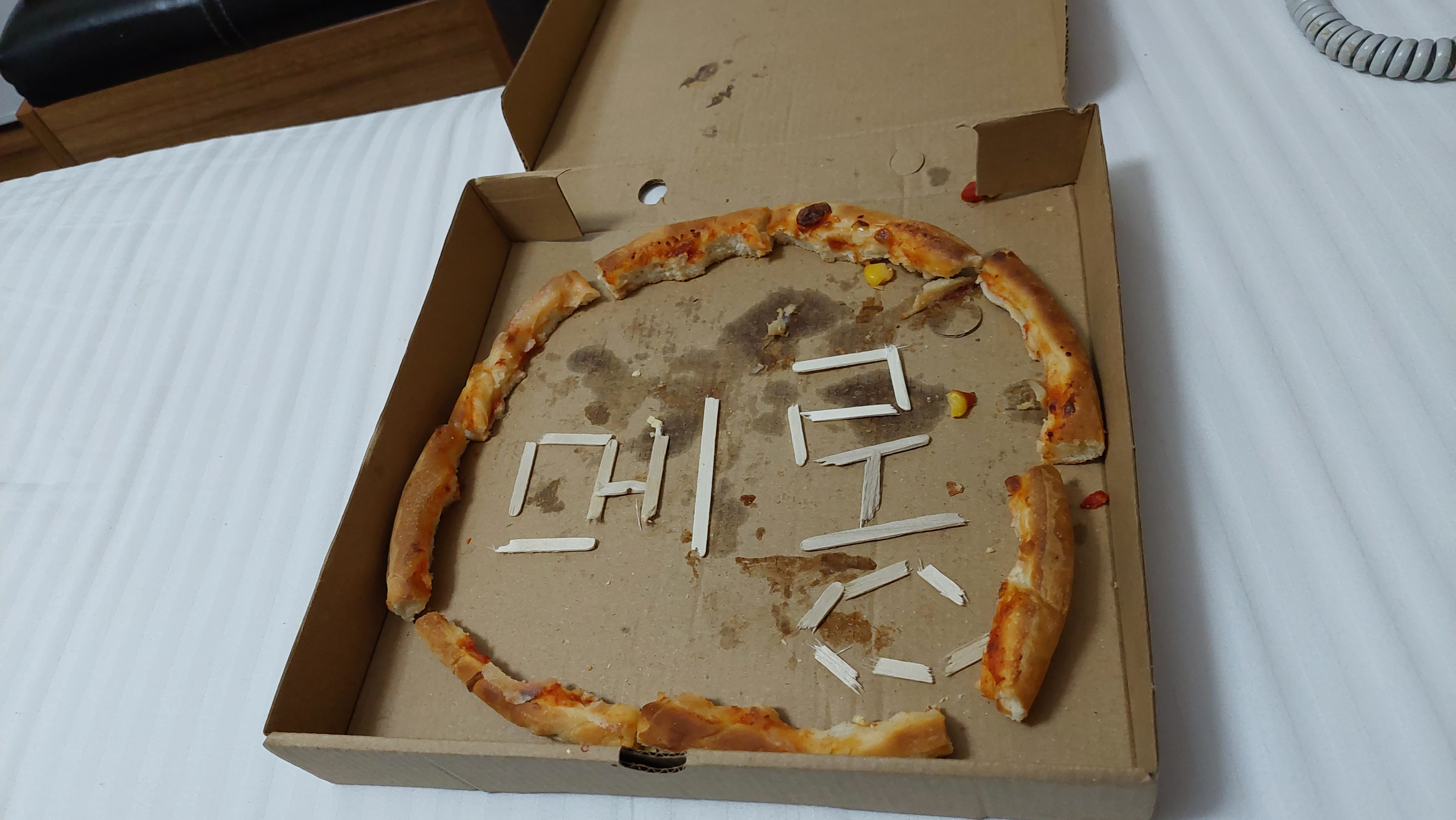 첫날밤 밥먹으러 안나간대서 피자포장해 갔더니 다먹고 저렇게 남김...ㅎㅎ