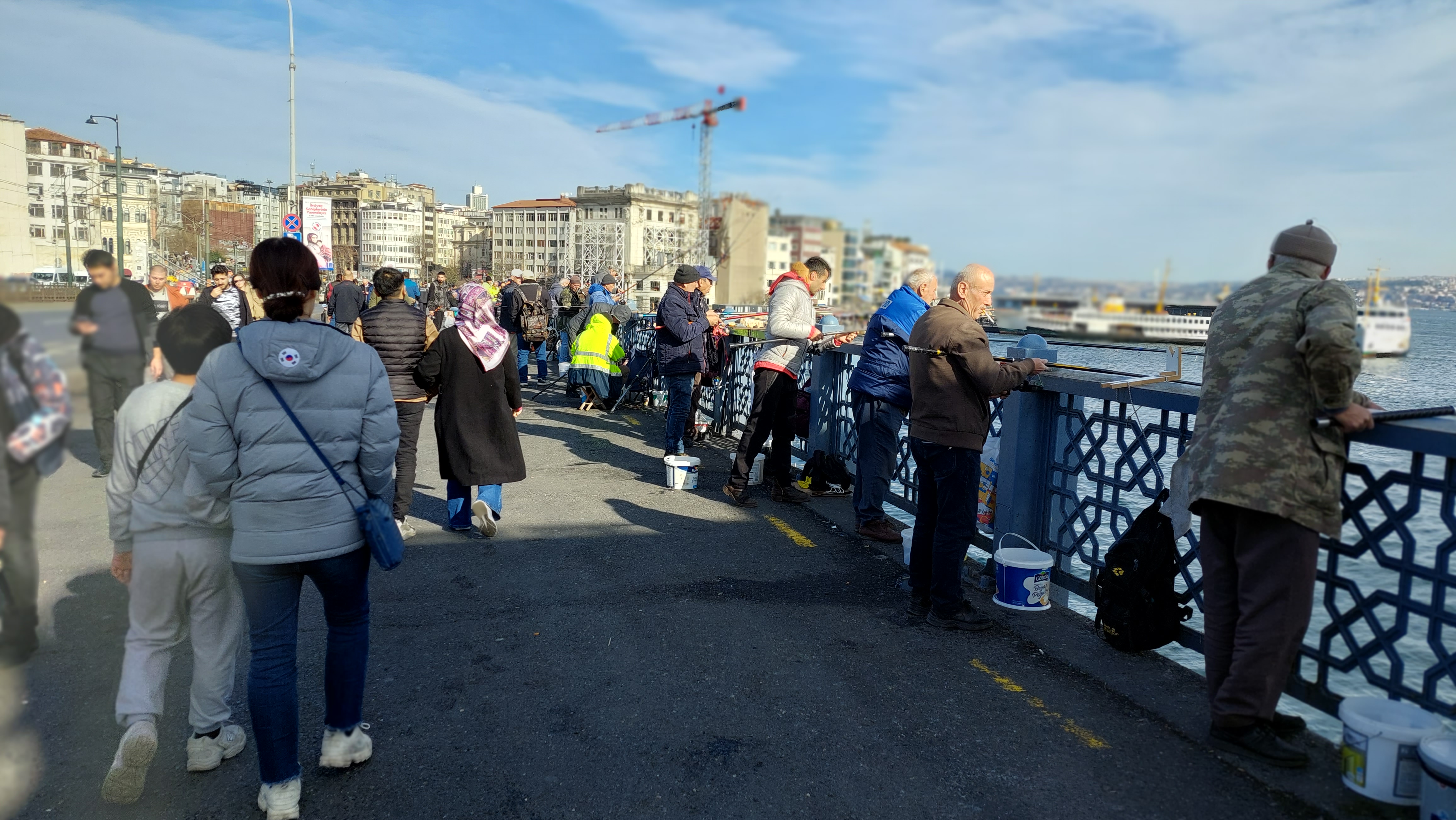 갈라타 다리위에서 낚시하는 사람들